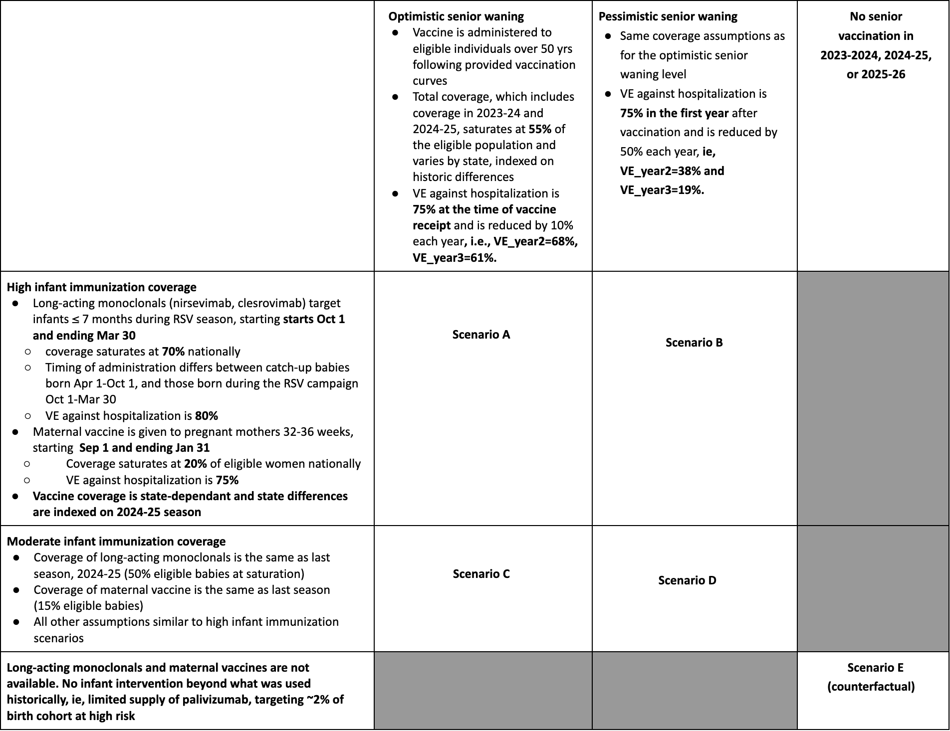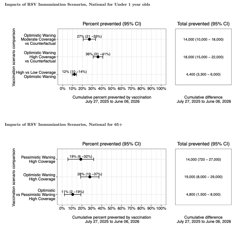 - Estimates of intervention benefits are sensitive to assumptions about vaccine waning and immunization coverage. In optimistic scenarios assuming a slow waning of vaccine protection in the second and third year after vaccine receipt, we project that 11% (95% CI 2-19%) and 4,800 (95% CI: 1,500-8,000) additional hospitalizations will be averted among seniors, compared to pessimistic scenarios modeling fast waning. In scenarios assuming high infant immunization coverage, we project 12% (10-14%) additional hospitalizations averted among infants, or 4,400 (95% CI 3,300-6,000) hospitalization, compared to moderate coverage scenarios.